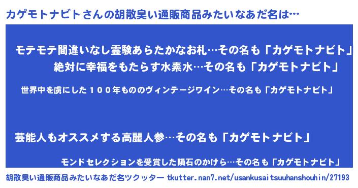 | 意味不明あだ名 | 『住所不定無職カゲモトナビト(10歳)』 |