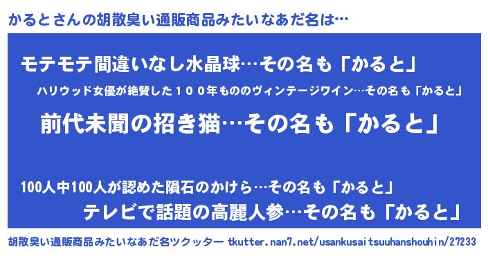 | ヘコむあだ名 | 『かると(笑)』『かるにゅー』 |