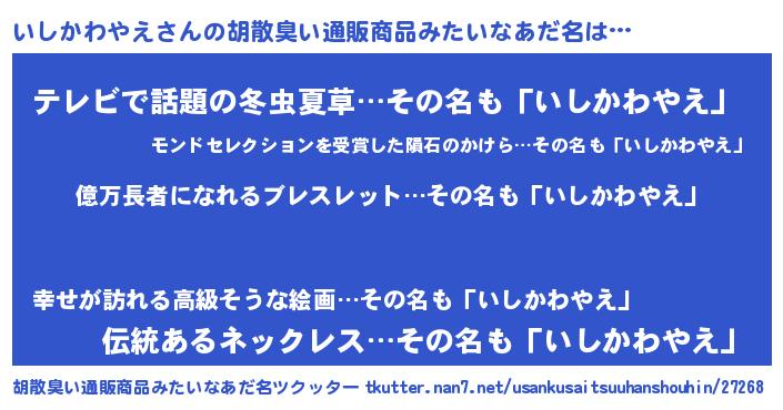 | ヘコむあだ名 | 『いしふぇ~』『いしっ子』『豆乳』 |
