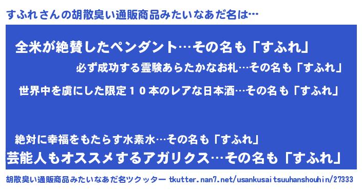 | 男性向けラノベタイトル風あだ名 | 『すふれに滅ぼされるだけの簡単なお仕事です』 |