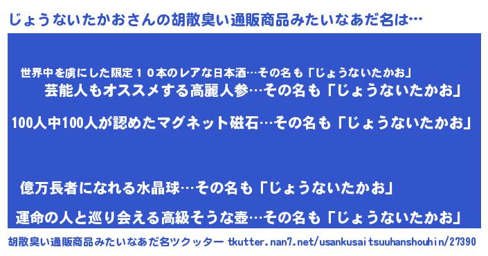 | 男性向けラノベタイトル風あだ名 | 『おまえをオタクにしてやるから、俺をじょうないたかおにしてくれ! 』 |