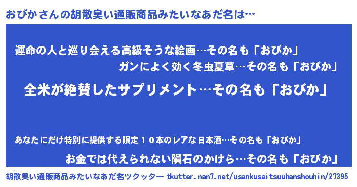 | 男性向けラノベタイトル風あだ名 | 『おびかの嫁は女の子じゃないと思った?』 |