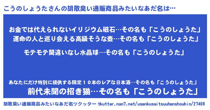 | ヘコむあだ名 | 『こうにゅー』『こうのしょうた(笑)』 |