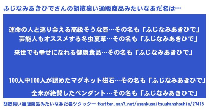 | 男性向けラノベタイトル風あだ名 | 『転生したらふじなみあきひでだった件』 |