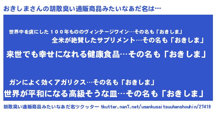 | 男性向けラノベタイトル風あだ名 | 『おきしまという概念が存在しない退屈な世界 』 |