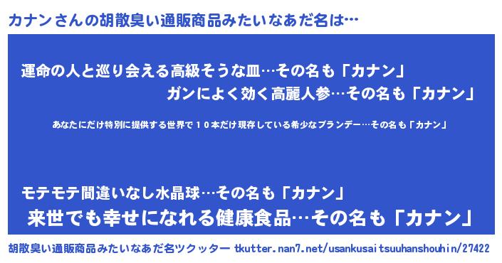 | 男性向けラノベタイトル風あだ名 | 『この素晴らしい世界にカナンを!』 |