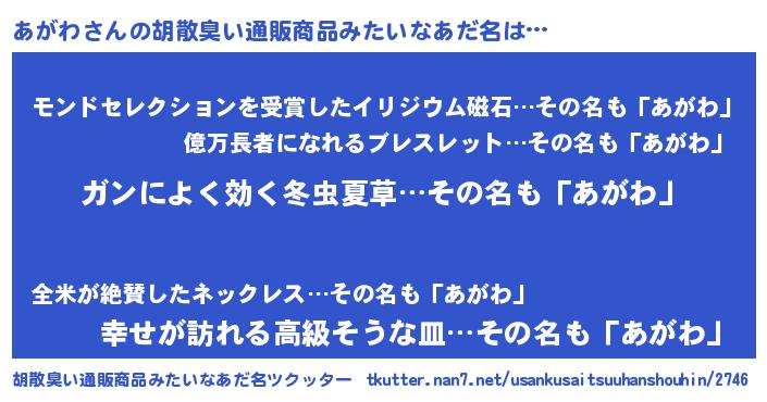 | 意味不明あだ名 | 『自称あがわ』『眠気覚ましガムあがわ味』 |