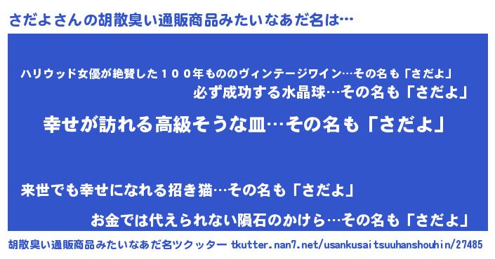 | 女子向けラノベタイトル風あだ名 | 『さだよの雑貨屋さん』『さだよ恋絵巻』 |
