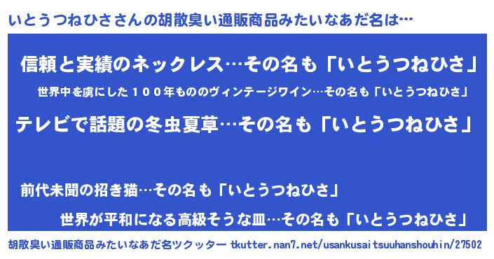 | 男性向けラノベタイトル風あだ名 | 『冴えないいとうつねひさの育てかた』 |