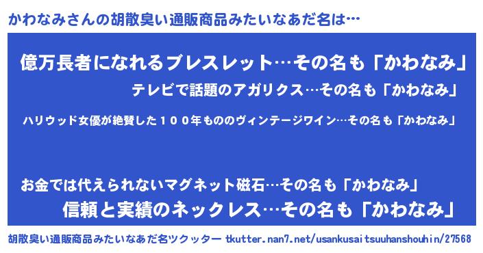 | 男性向けラノベタイトル風あだ名 | 『カワナミスレイヤー』『かわなみの憂鬱』 |