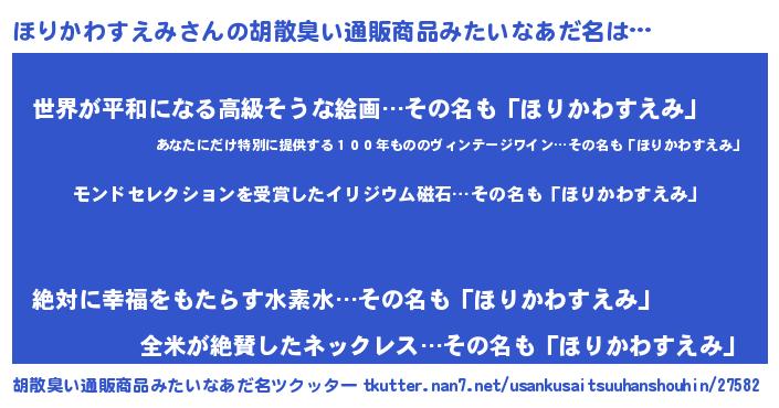 | 男性向けラノベタイトル風あだ名 | 『ほりかわすえみに滅ぼされるだけの簡単なお仕事です』 |