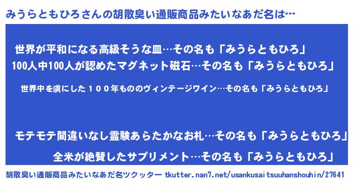 | 男性向けラノベタイトル風あだ名 | 『魔弾の王とみうらともひろ』 |
