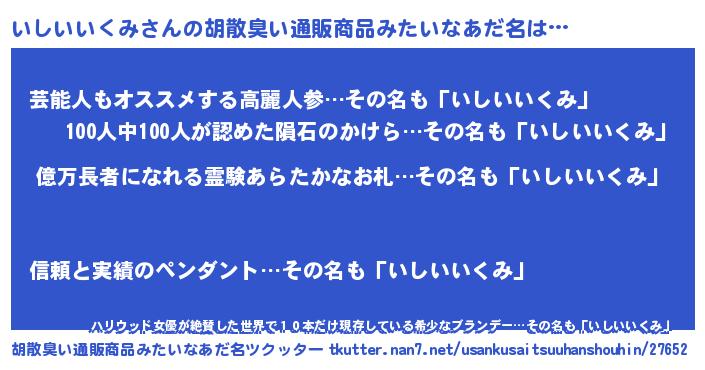 | 男性向けラノベタイトル風あだ名 | 『うちのいしいいくみが世界を掌握している!』 |