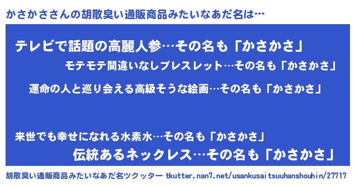 | 意味不明あだ名 | 『かさかさフォーエバー』『自称かさかさ』 |