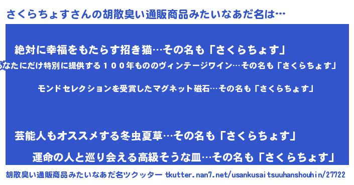 | 男性向けラノベタイトル風あだ名 | 『さくらちょすに滅ぼされるだけの簡単なお仕事です』 |