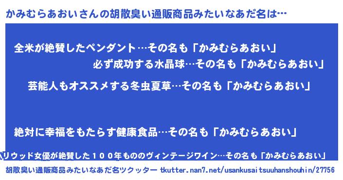 | 男性向けラノベタイトル風あだ名 | 『Re:かみむらあおいから始める異世界生活』 |