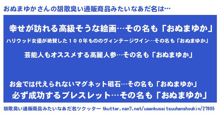 | 意味不明あだ名 | 『自称おぬまゆか』『ペロリンおぬまゆか』 |