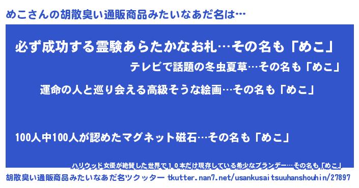 | ヘコむあだ名 | 『酢こんぶ』『めこにゅー』『めこお』 |