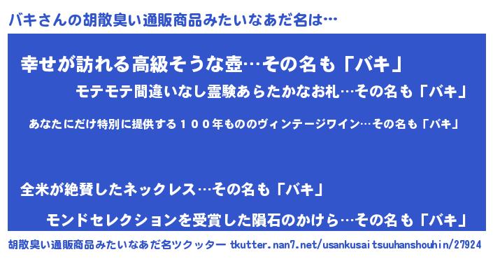 | 意味不明あだ名 | 『住所不定無職バキ(8歳)』『ペロリンバキ』 |