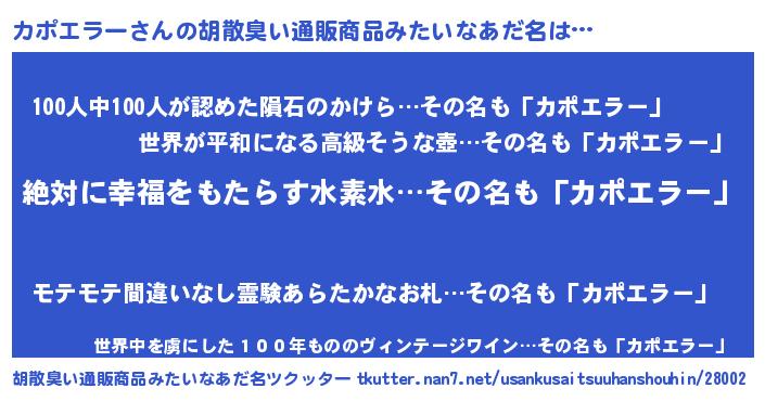 | 男性向けラノベタイトル風あだ名 | 『カポエラーという概念が存在しない退屈な世界 』 |