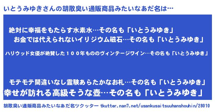 | 意味不明あだ名 | 『住所不定無職いとうみゆき(9歳)』 |