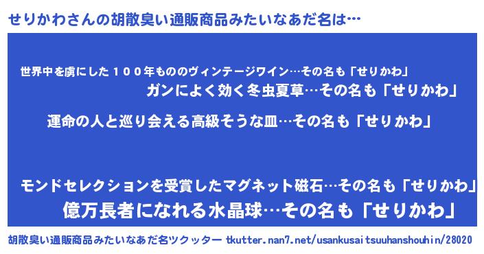 | 男性向けラノベタイトル風あだ名 | 『うちのせりかわが世界を掌握している!』 |