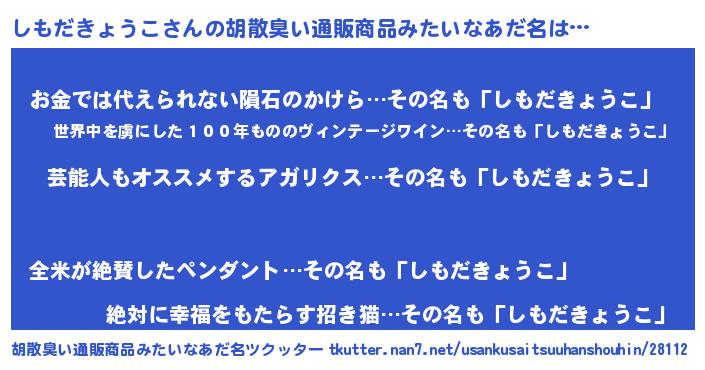| 意味不明あだ名 | 『自称しもだきょうこ』 |