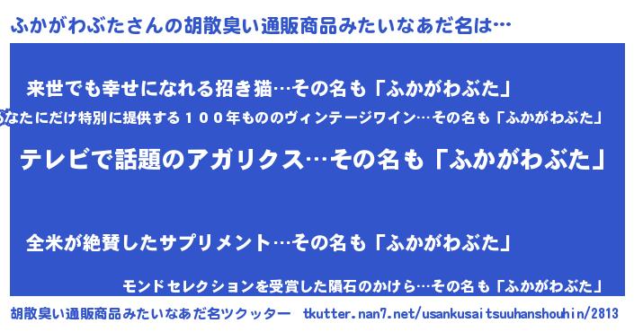 | 男性向けラノベタイトル風あだ名 | 『ふかがわぶたに滅ぼされるだけの簡単なお仕事です』 |