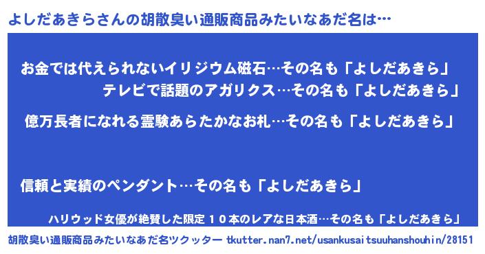 | ヒーロー風カッコイイあだ名 | 『スーパーヨシダアキラ』『仮面ヨシダー』 |
