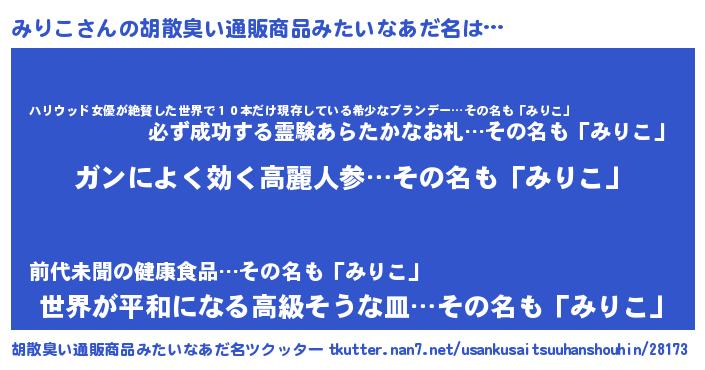 | 男性向けラノベタイトル風あだ名 | 『ミリコスレイヤー』『魔弾の王とみりこ』 |