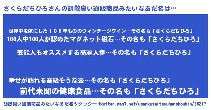 | ヘコむあだ名 | 『さくらだちひろ(笑)』『なまこ酢』 |