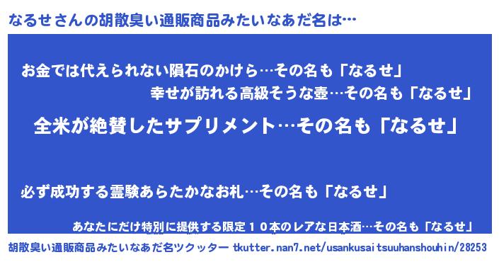 | 男性向けラノベタイトル風あだ名 | 『なるせに滅ぼされるだけの簡単なお仕事です』 |
