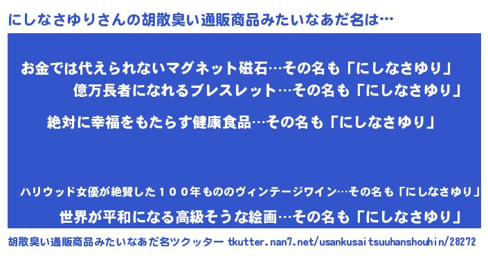 | ヘコむあだ名 | 『にしなさゆり(笑)』『豆乳』 |