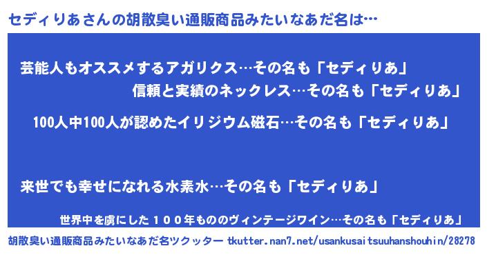 | 男性向けラノベタイトル風あだ名 | 『おまえをオタクにしてやるから、俺をセディりあにしてくれ! 』 |