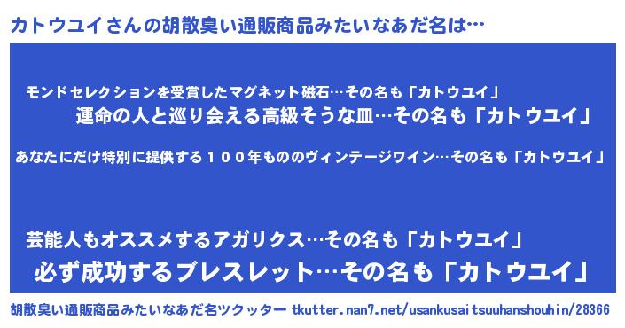 | 男性向けラノベタイトル風あだ名 | 『この素晴らしい世界にカトウユイを!』 |