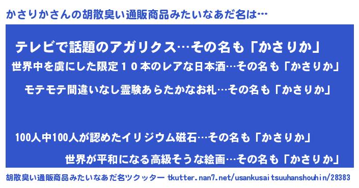 | 男性向けラノベタイトル風あだ名 | 『かさりかの憂鬱』『魔弾の王とかさりか』 |