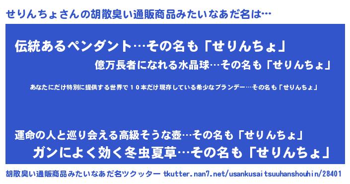| 意味不明あだ名 | 『住所不定無職せりんちょ(79歳)』 |