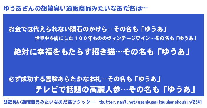 | 女子向けラノベタイトル風あだ名 | 『異世界で失敗しない100のゆうあ』 |