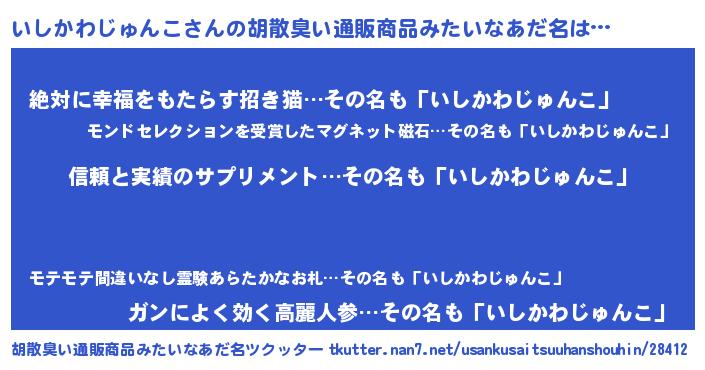 | 男性向けラノベタイトル風あだ名 | 『ダンジョンにいしかわじゅんこを求めるのは間違っているだろうか』 |