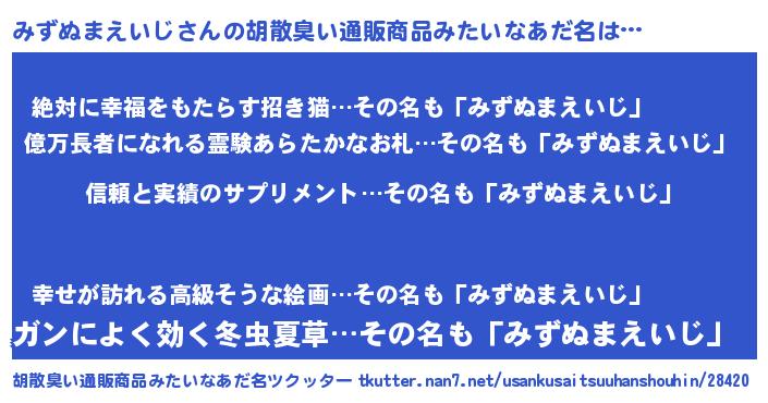 | ヘコむあだ名 | 『みずお』『みずぬまえいじ(笑)』 |