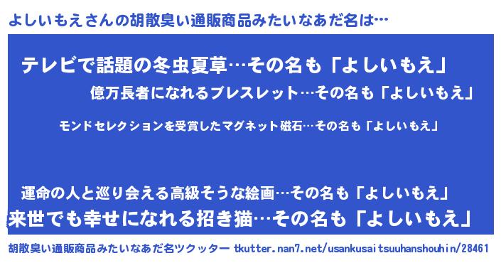 | 意味不明あだ名 | 『ニラ科よしいもえ属』『自称よしいもえ』 |