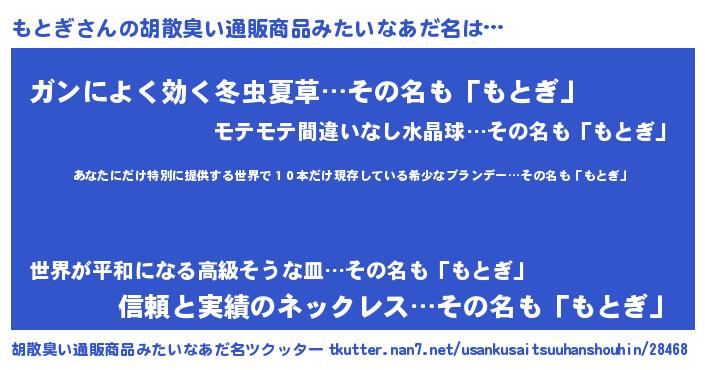 | 意味不明あだ名 | 『住所不定無職もとぎ(91歳)』『自称もとぎ』 |