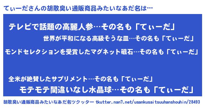 | 男性向けラノベタイトル風あだ名 | 『てぃーだに滅ぼされるだけの簡単なお仕事です』 |