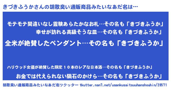 | 男性向けラノベタイトル風あだ名 | 『きづきふうかの嫁は女の子じゃないと思った?』 |