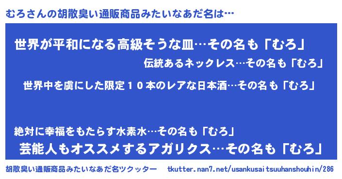 | 意味不明あだ名 | 『住所不定無職むろ(65歳)』『自称むろ』 |