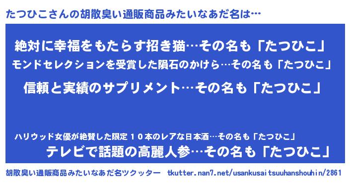 | 意味不明あだ名 | 『とにかく怪しいたつひこ』 |