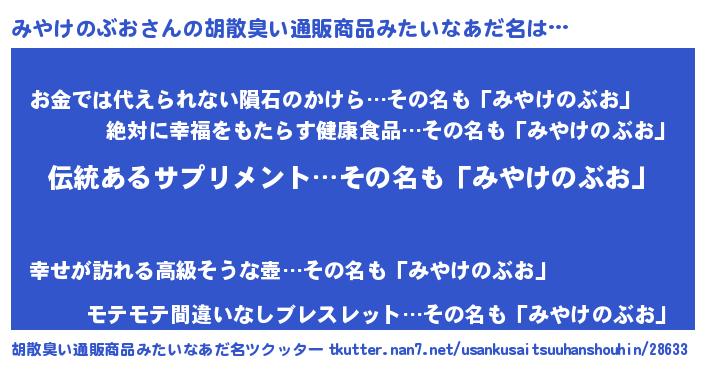 | ヘコむあだ名 | 『みやお』『みやもー』『つくし』 |