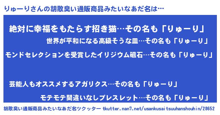 | ヒーロー風カッコイイあだ名 | 『慈愛の使者りゅーり』『ネオリューリ』 |