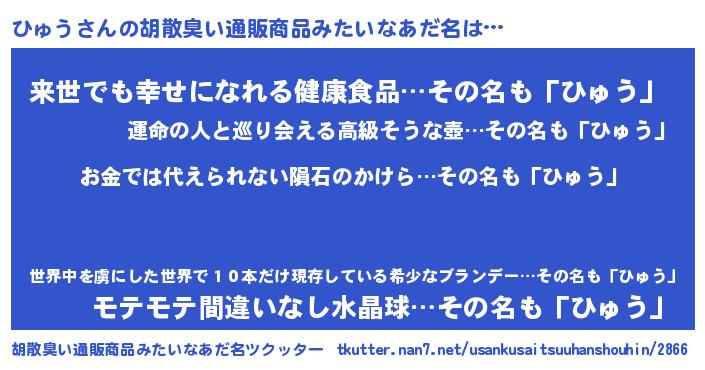 | ヘコむあだ名 | 『ひゅう(震え声)』『ひゅにゅー』 |
