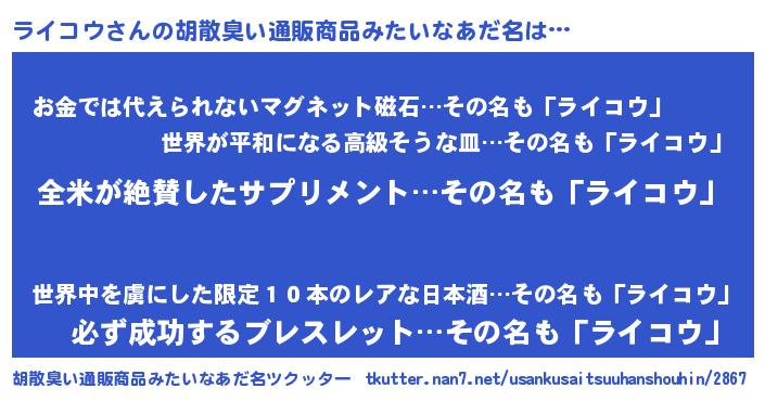 | 男性向けラノベタイトル風あだ名 | 『ライコウの嫁は女の子じゃないと思った?』 |